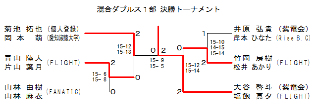 | 竹岡 房樹 松井 あかり (FLIGHT) | ○ 14-15 15-12 15- 9 | ○ 9-15 15-12 15-13 | 1 | |