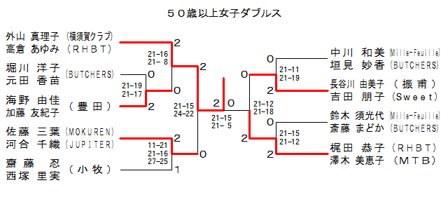 | 50WD-5 | RHBT・MTB | 梶田 恭子・澤木 美恵子 | 2 | 21-15 21-12 | 0 | 鈴木 須光代・斎藤 まどか | Mille-Feuille・BUTCHERS | |