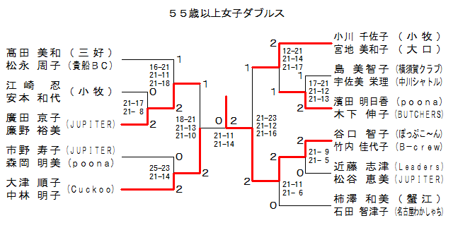 | 55WD-6 | ¬–qE‘åŒû | ¬ì 粎qE‹{’n ”ü˜aŽq | ‚Q | 12-21 21-14 21-17 | ‚P | à_“c –¾“úE–؉º LŽq | poona¥BUTCHERS | |