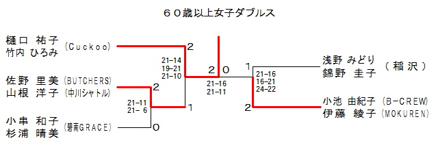 | 60WD-1 | BUTCHERS・中川シャトル | 佐野 里美・山根 洋子 | 2 | 21-11 21- 6 | 0 | 小串 和子・杉浦 晴美 | 碧南GRACE | |
