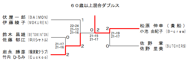 | 60XD-3 | 貴船・B−crew | 松原 伸幸・小池 由紀子 | 2 | 21-19 21-17 | 0 | 佐野 章・佐野 里美 | BUTCHERS | |