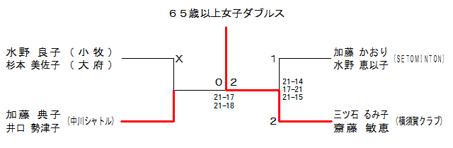 | 65WD-3 | ‰¡{‰êC. | ŽOƒcÎ ‚é‚ÝŽqEâV“¡ •qŒb | ‚Q | 21-17 21-18 | ‚O | ‰Á“¡ “TŽqEˆäŒû ¨’ÃŽq | ’†ìƒVƒƒƒgƒ‹ | |