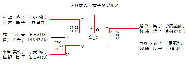 | 70WD-3 | –¼ŒÃ‰®“¿ìE•É“ì‚f‚q‚`‚b‚d | ‘q’J ¹ŽqE™‰Y ‰ëŽq | ‚Q | 21-23 21-18 21-17 | ‚P | ’†’J ‚¦‚ÝŽqE’Ëè —ÇŽq | ”ö’£ˆ®Eˆî‘ò | |