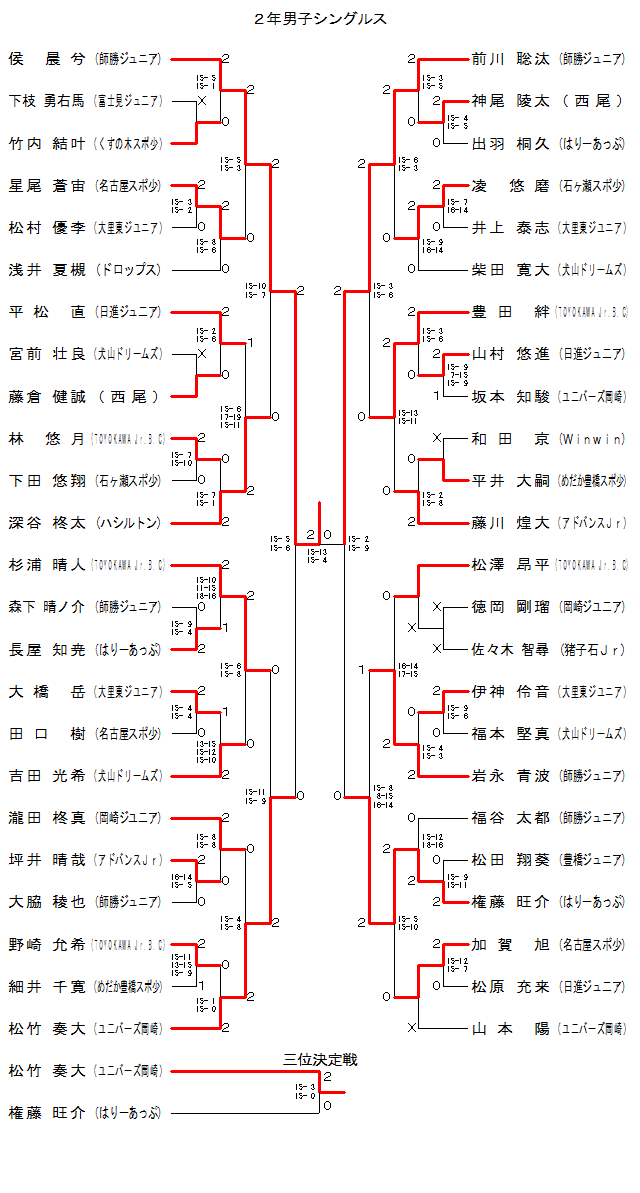 | MS2-19 | 日進ジュ二ア | 平松 直 | 2 | 15- 2 15- 6 | 0 | 藤倉 健誠 | 西尾 | |