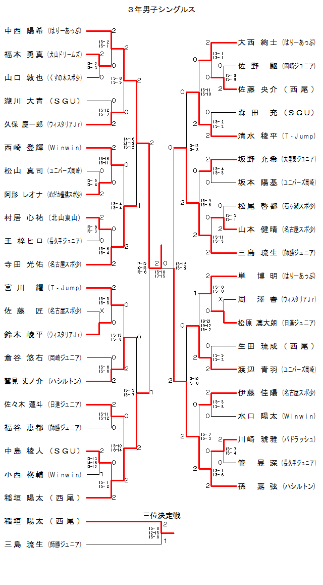 | MS3-13 | 名古屋スポ少 | 寺田 光佑 | 2 | 15- 6 15- 4 | 0 | 村居 心祐 | 北山東山 | |