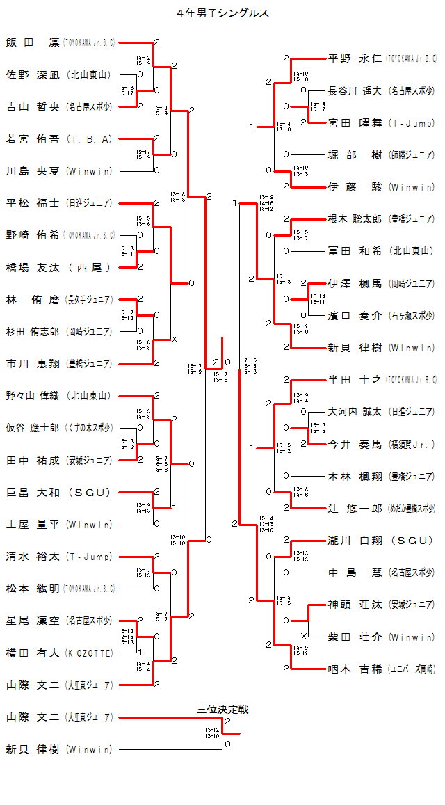 | MS4-32 | TOYOKAWA Jr.B.C | 半田 十之 | 2 | 15- 5 15-12 | 0 | 辻 悠一郎 | めだか豊橋スポ少 | |