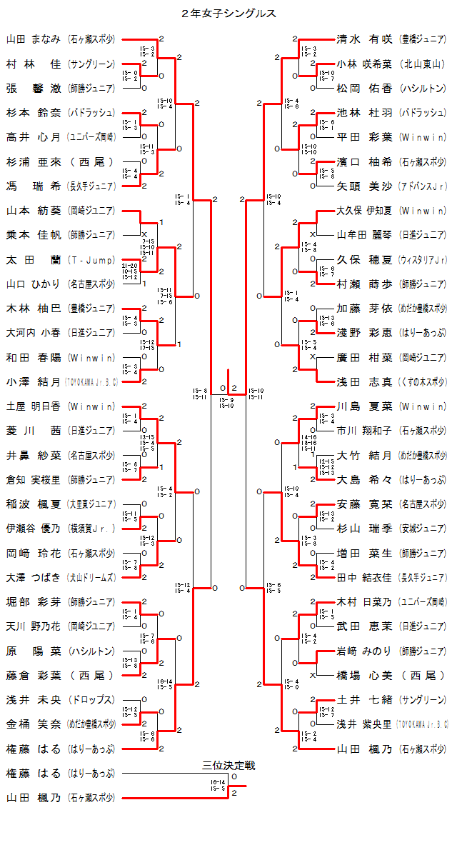 | WS2-6 | 豊橋Jr. | 木林 柚巴 | 2 | 15- 4 15- 3 | 0 | 大河内小春 | 日進ジュ二ア | |